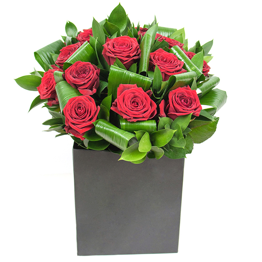 Embrace the elegance of our timeless red rose bouquet. This exquisite arrangement combines rich red roses with the deep greenery of aspidistra leaves and the subtle beauty of ruscus, creating a unique and captivating display.
