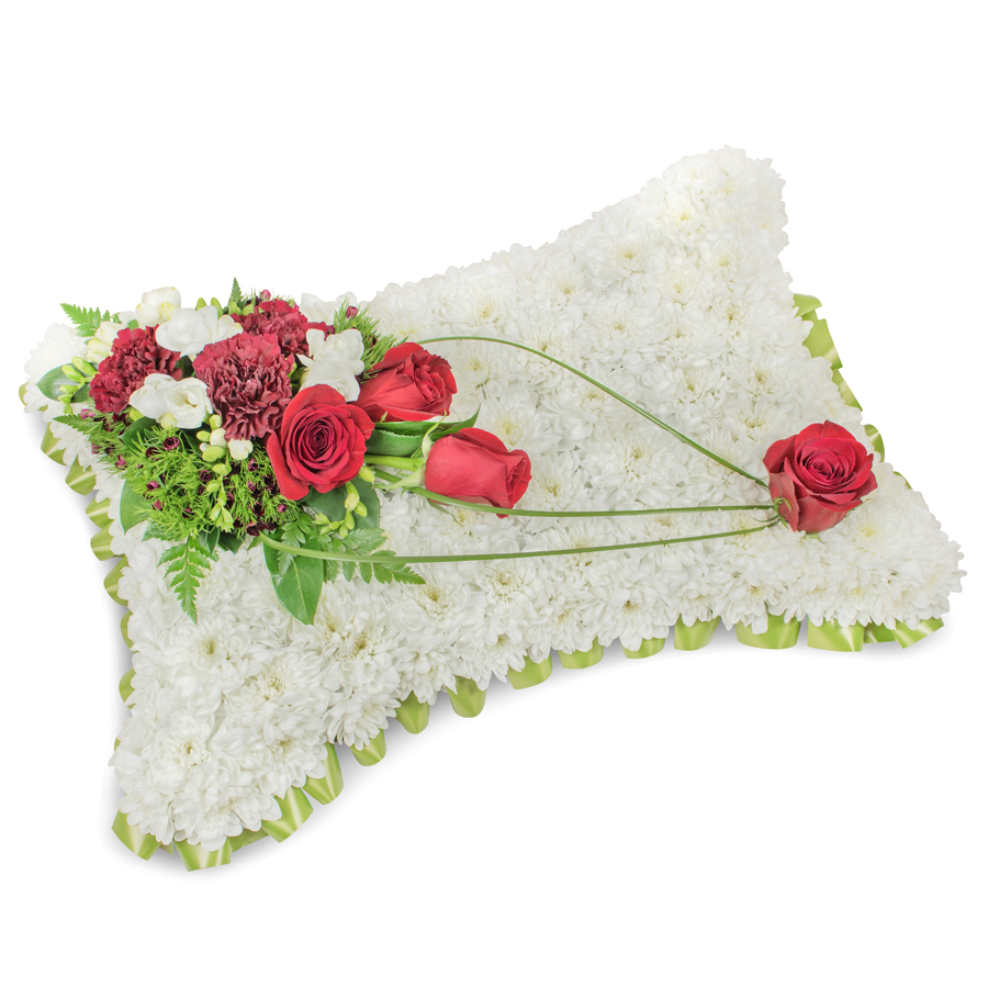 Express your deepest sympathies with our heartfelt bouquet, featuring white chrysanthemums, classic red roses, sweet white freesias, and intense dark red carnations. Complemented by dianthus and bear grass, this arrangement symbolizes both beauty and compassion.